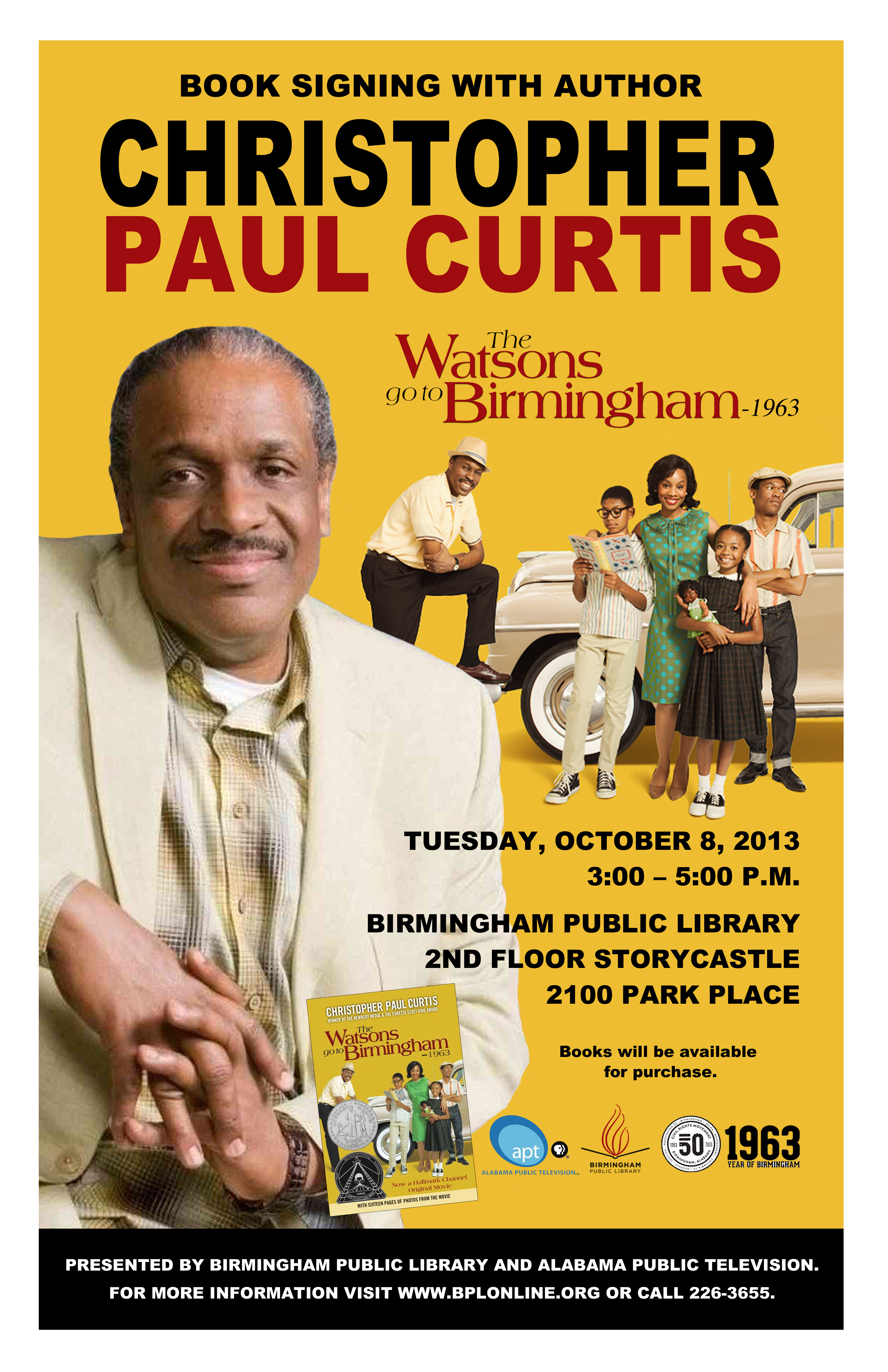 By Chanda Temple Author Christopher Paul Curtis feels comfortable in a library. It’s where he’s written many of his books, including his first one, The Watsons Go to Birmingham – 1963, which has won numerous awards. On Tuesday, Oct. 8, he will visit the Birmingham Public Library. But it won’t be to work on his… Continue reading Man of the Hour: Author Christopher Paul Curtis
